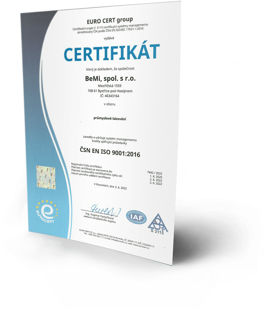 Společnost BeMi má zavedený systém řízení kvality podle normy ISO 9001, který zajišťuje stabilní úroveň výroby a kontrolované procesy.