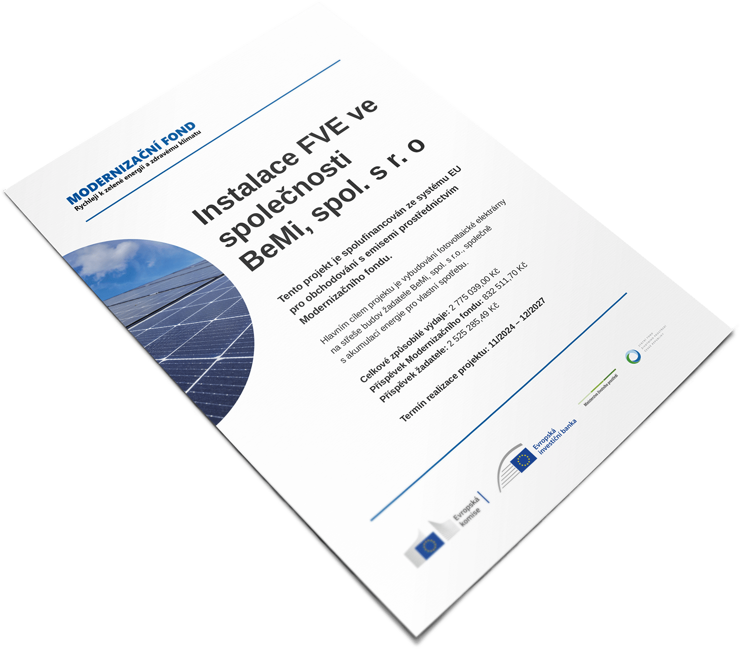 Projekt instalace fotovoltaické elektrárny ve společnosti BeMi je spolufinancován z Modernizačního fondu.